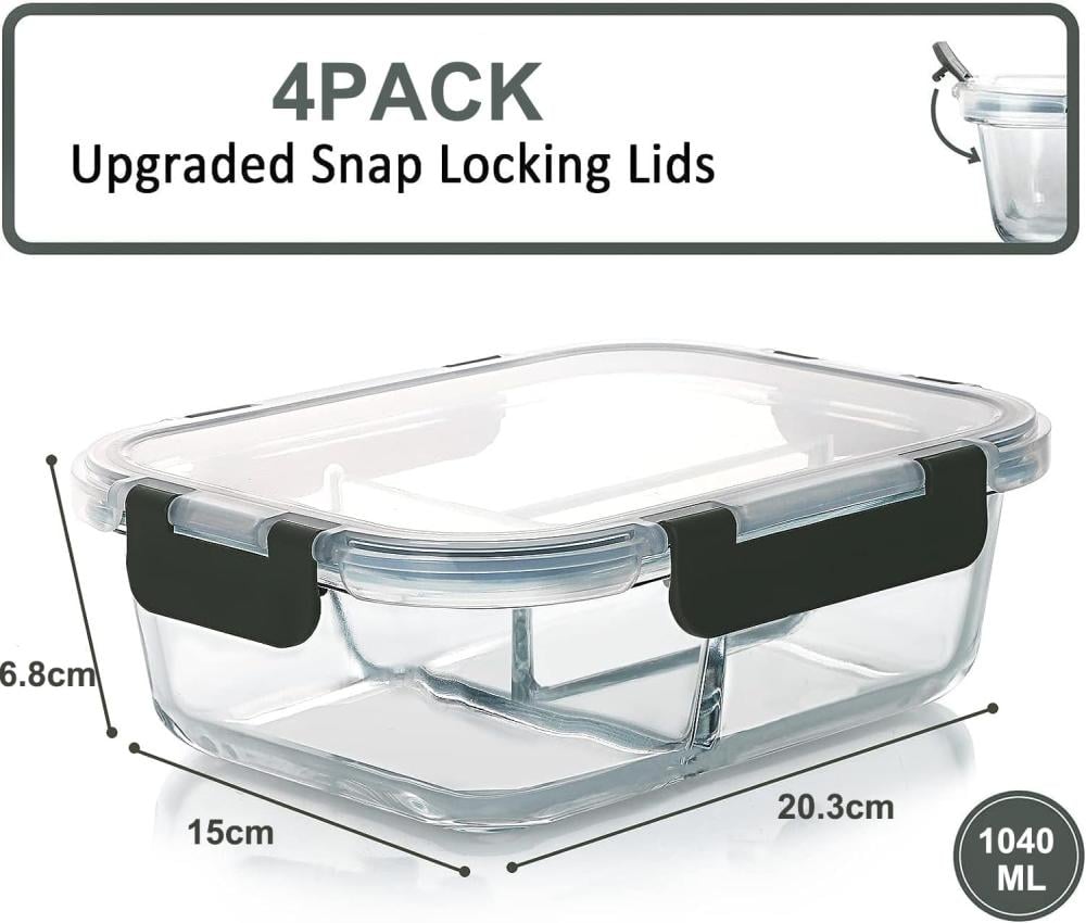 عبوات تحضير الوجبات الزجاجية من ميلند دي 4 عبوات زجاج سعة 1040 مل لتخزين الطعام مزودة بأغطية غداء بينتو زجاجية صندوق لتحضير في الميكروويف والفريزر وغسالة الصحون.